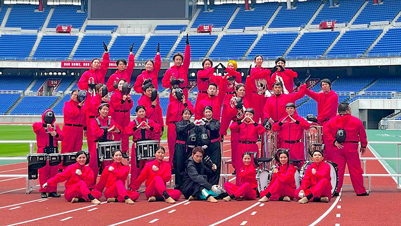 バッテリーと呼ばれるドラム(Drum) とG管で作られている金管楽器(Bugle)によって構成され、軍隊の音楽隊として発祥したものなのでCorps(小隊)と呼ばれています。フラッグやライフルなどの手具を使用し、音楽を視覚的に表現するカラーガード(Colorguard)や、パーカッション楽器を演奏するフロントピット(Frontpit)などと共に演奏しながら様々なフォーメーションを作る音楽団体のことをドラムコーといいます。