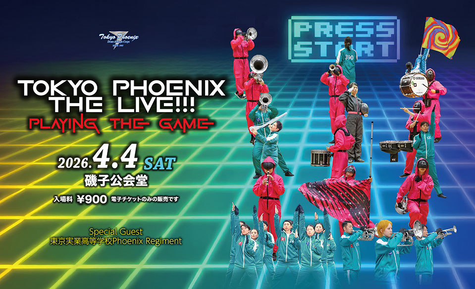 今年度のショープログラム「PARADOX」もLIVEバージョンとして新たに披露させていただきます。またゲストには東京実業高等学校Phoenix Regiment Drum&Bugle Corpsをお迎えし、合同演奏も予定しております。今年のLIVEテーマは、【Playing The Game!!】